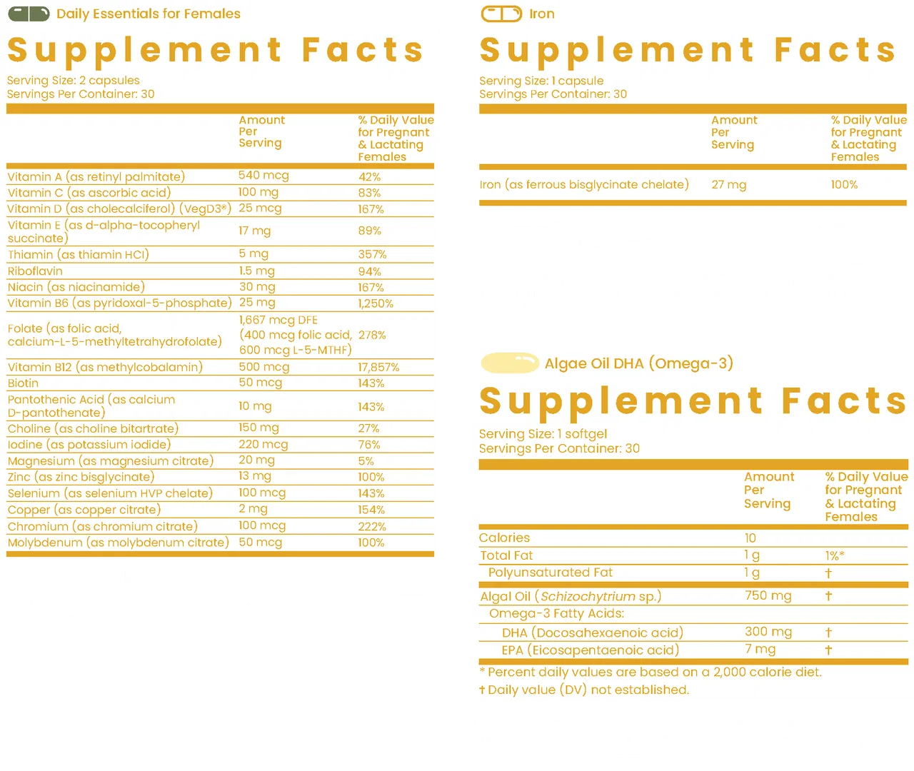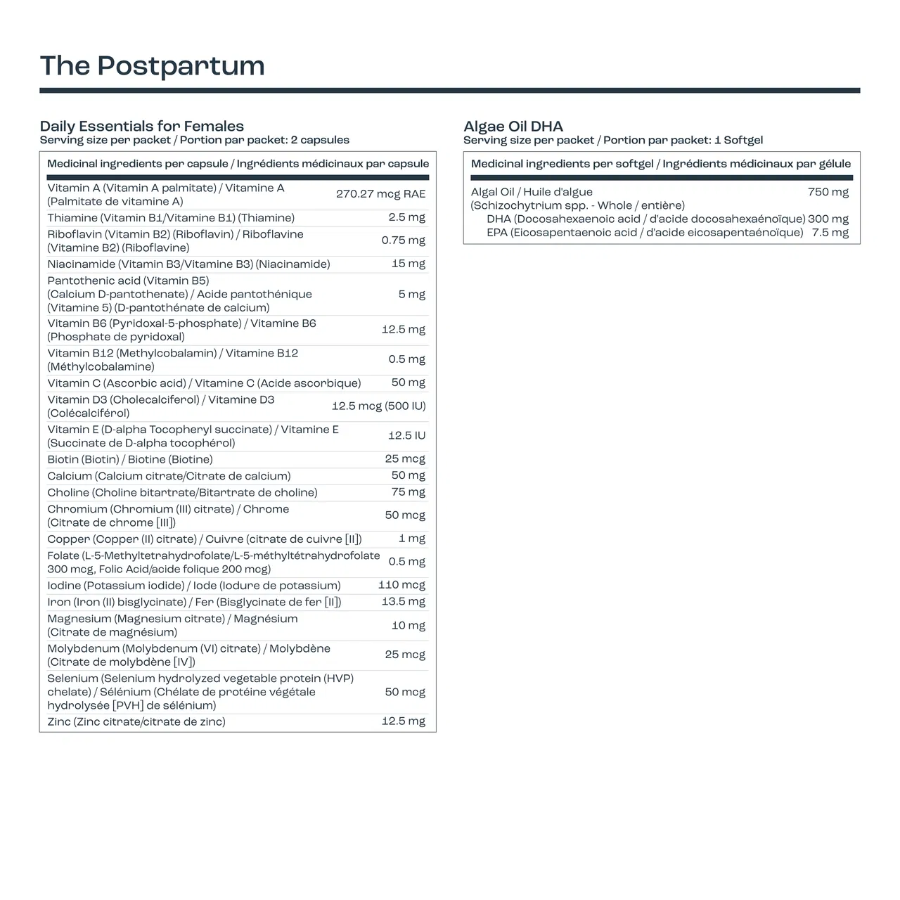 The new Postpartum Pack contains the clinical-grade nutrients and third-party-tested ingredients that doctors recommend—now in a gentler formula. We switched to a gentler form of Zinc and reduced the amount of both Zinc and Vitamin B12, while still ensuring you get the recommended daily value. Iron has also been reformulated into a gentler form and placed in its own capsule to support stability and easier digestion. We’ve also removed Calcium so that Iron can shine—no competition for absorption.